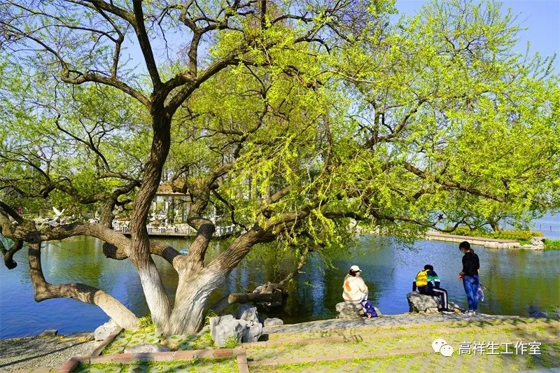 湖岸的空地上植满了观赏树,有成片的樱花,也有零星的梅花、桃花、杏花……岸边的凉亭、长廊中通常都有休闲的人们,有的在聊天、品茶,有的在棋盘上对弈,……亭边常有嬉闹的儿童和练气功、打太极的老人。