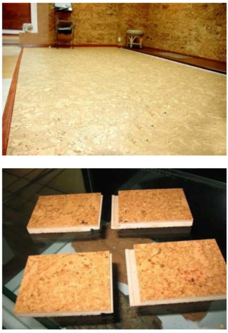 软木地板是由软木片、软木板和木板复合而成的地板。既适用于家庭居室,也适用于商店走廊、舞厅、图书馆等人流量大、难以避免砂粒的场所。软木地板具有保温隔热性好、不易燃烧、弹性好、噪音小、适用于儿童活动空间等优点。根据不同的应用需要,软木地板可被加工成块状、条状、卷状(图1-3-11)。