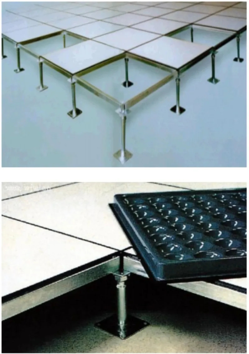 活动地板是指由金属材料或特制刨花板为基材,表面覆以三聚氰胺装饰板,以胶粘剂胶合成的架空地板(图1-3-15)。它配有专用的钢木梁、橡胶垫条及可调节的金属支架。主要是满足计算机房等有特殊要求场所的地面铺设。活动地板抗静电、耐磨耐燃性好、便于通风,架空层便于走线,安装维修方便,可随意开启和拆迁,同时也具有一定的装饰功能。