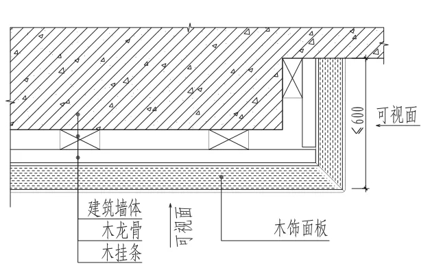 阴、阳角木饰面其中一面宽度不大于600mm时,必须将其与另一面按设计的角度组装固定。