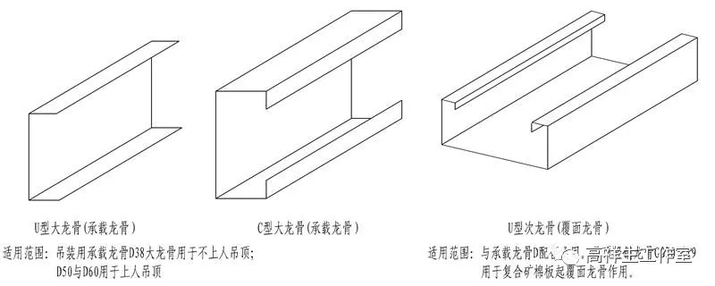 龙骨是指罩面板的骨架材料。轻钢龙骨是以冷轧钢板(带)、镀锌钢板(带)或彩色涂层钢板(带)为原料,经冷弯工艺制成的薄壁型材。它具有强度大、通用性强、耐火性好、安装简易等优点,可用于装配各类型的石膏板、钙塑板、吸音板等多种板材。主要用作罩面板装饰的龙骨支架等(图 6-2-6)。