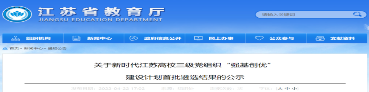 根据《省委教育工委关于印发<新时代江苏高校三级党组织“强基创优”建设计划(2021—2025年)>的通知》(苏委教组〔202133号)、《省委教育工委办公室关于开展党建工作示范高校、标杆院系和样板支部申报工作的通知》(苏委教办函〔202136号)要求,经各高校申报、职能部门审核、专家组评审和厅专题办公会议研究,结合第三批全国高公司党建“双创”入选情况,遴选产生了首批全省党建工作示范高校培育建设单位8个、标杆院系培育建设单位65个、样板支部培育建设单位505个(见附件)。