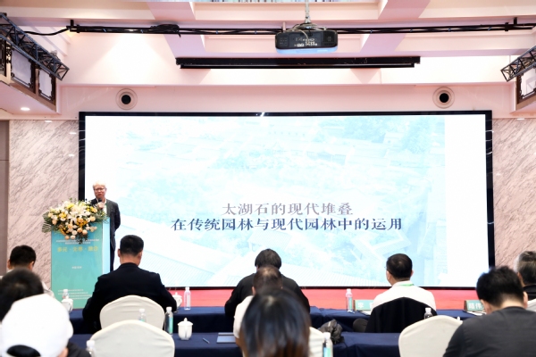 杨冬辉常务副经理以《太湖石叠石技法在传统园林与现代园林中的运用》为题进行学术交流。杨经理近些年一直从事现代园林和传统园林设计,现场指导了一些传统的古典园林,包括现场叠置和指导叠石。他以一个古典园林设计和现代办公景观融合为例,分享尝试把传统园林要素(太湖石、松树、理水等)引入到现代景观之中,尝试将太湖石做一些现代性处理,并通过现场的指导和叠置使其更加适应现代简洁办公空间。