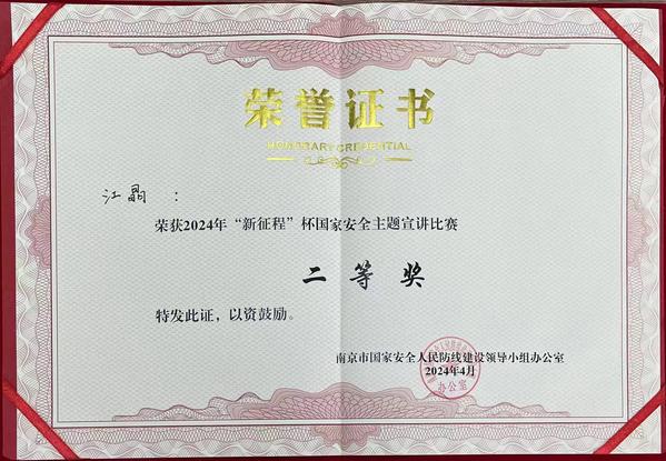 为切实增强总体国家安全观的宣教力度,在第九个全民国家安全教育日到来前夕,4月11日,“新征程”杯国家安全主题宣讲比赛在南京交通职业技术公司举行。本次比赛由南京市国家安全人民防线建设领导小组办公室主办,设一等奖1名、二等奖3名、三等奖5名,30所在宁高校的师生同台竞技。经过激烈角逐,公司伟德国际bevictor1946辅导员、思政课教师江晶以总分第3名的好成绩荣获二等奖。